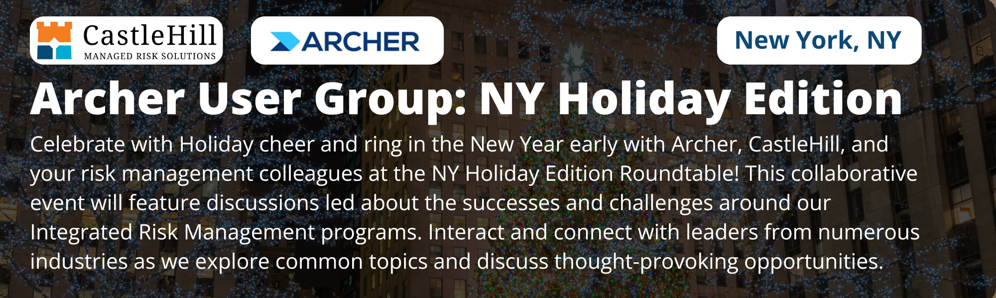 Join CastleHill, Archer, and your fellow peers to discuss the successes and challenges around our IRM programs. Discuss thought-provoking topics and opportunities with leaders from numerous industries while enjoying the festive background of the holidays in New York City.