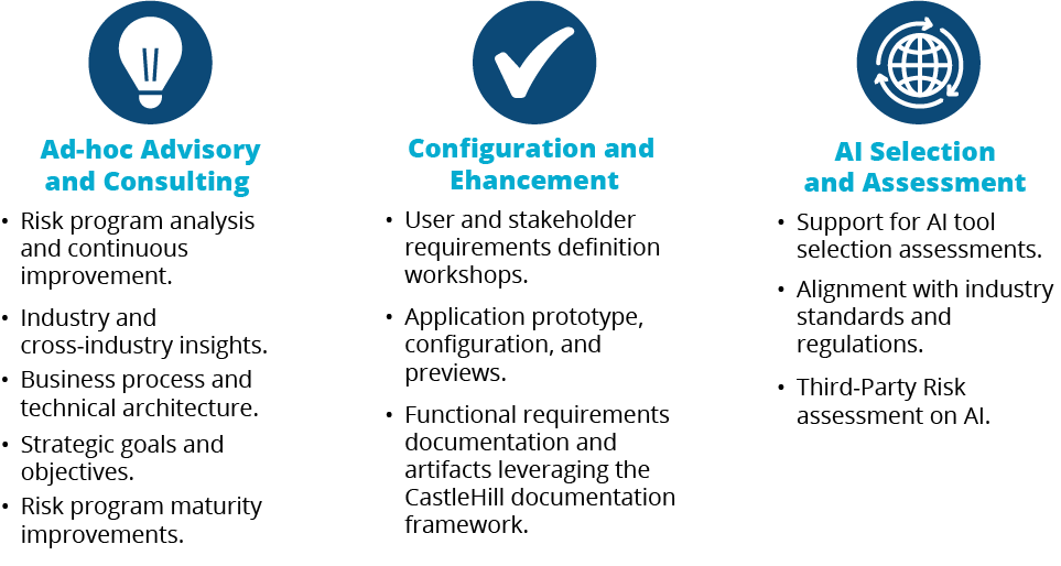 CastleHill leverages over a decade of experience to bring you and your organization GRC as a Service on AI: a collection of managed services designed to support your business needs. Identify and monitor your risk with on-demand consultations, proprietary accelerators, and industry-tested best practices. Design a complete AI governance program, from strategy and assessment to vendor oversight and training.